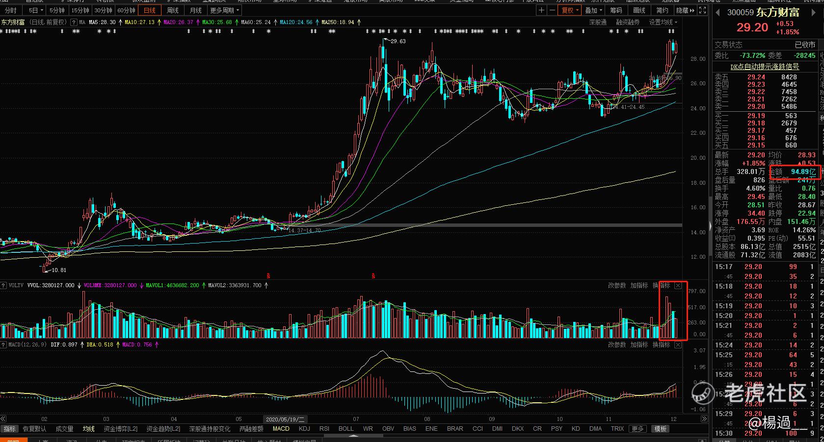 案例:東方財富,每天成交量百億! 互聯網券商作為近期大金融板塊的核心之一,比較火熱,類似的品種,大家可以從每天的成交額來判斷,成交額前10名的,一般都是市場的熱點品種。
