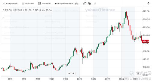 过去十年中,HSY的股价整体呈现上升趋势,但近一年经历了一些波动。从2014年约100美元的股价起步,至2023年达到270美元以上,十年间增长约170%。然而,2023年HSY的股价从最高点275美元下跌至近期的180美元左右,在过去一年里主要在180美元至210美元之间波动。