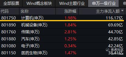 资金面上,主力资金大举涌入计算机板块,Wind数据显示,计算机板块全天获主力资金净流入116.17亿元,霸居31个申万一级行业首位!