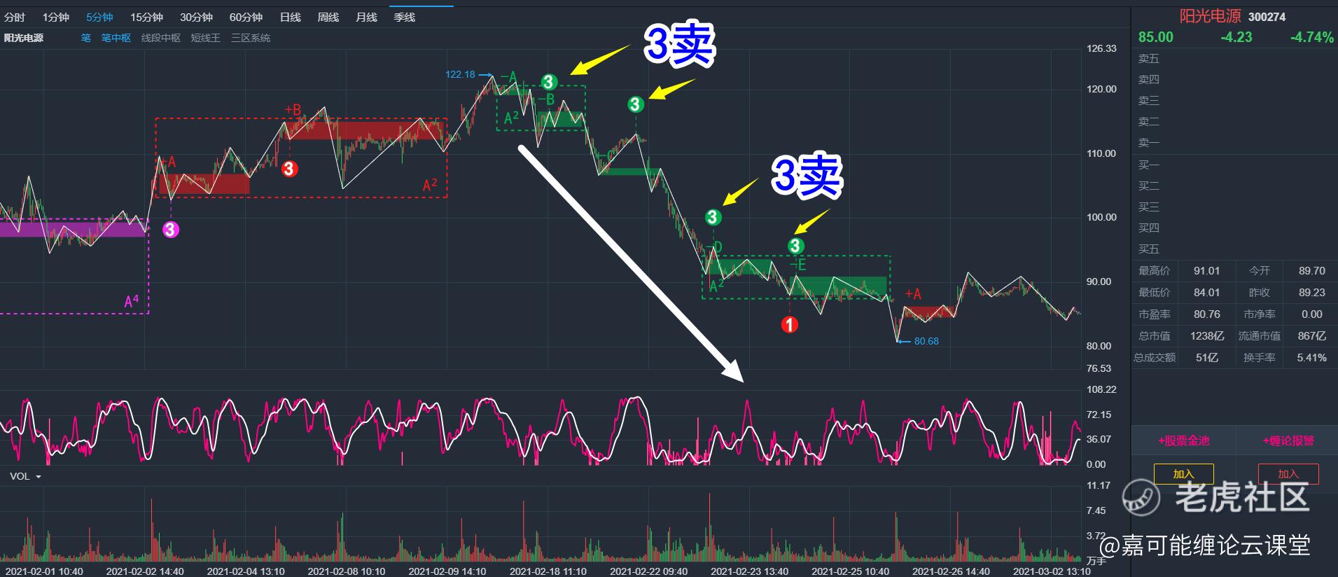 按照缠论三类买卖点的划分,下跌的形成有一个重要的标志就是是否形成缠论3卖。某个股票走势一旦出现缠论3卖,意味着上涨行情彻底结束,正式下跌开始。不管什么周期级别,级别越大,下跌缠论下跌力度越大。在A股,通常一个5分钟的短线缠论3卖形成的下跌,股票都可以回撤好几十个点。比如最近的阳光电源(300274)5分钟连续性缠论3卖,股票回撤不少,如下图所示: