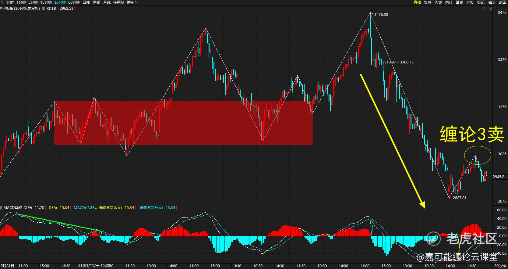 换而言之,不管你是交易短线还是中长线,缠论3卖都是你最后的清仓回撤点。比如:交易短线,5分钟周期级别,一旦5分钟出现缠论3卖,你就需要按照缠论纪律标准,清仓离场。同样交易级别如果是30分钟也是一样的。
