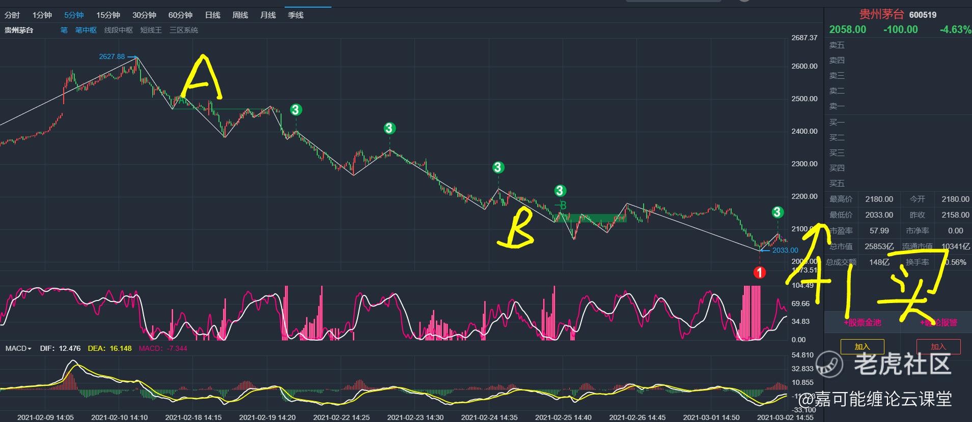 比如:今天的贵州茅台(600519)就属于这种标准的走势类型。形成缠论3卖暴跌后,今天出现了一个缠论1类买点背驰,如下图所示: