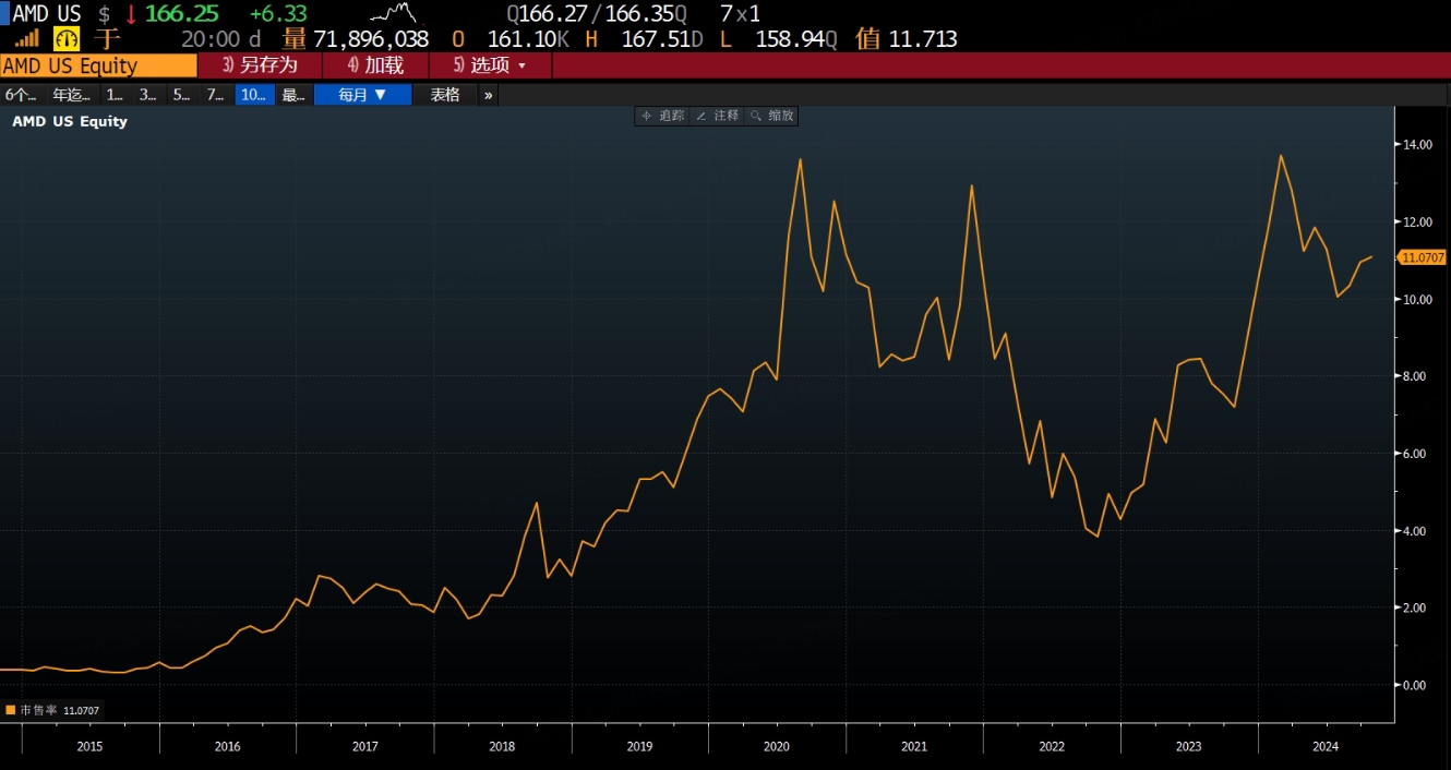 从估值上看,AMD当下的市销率可不低,处于历史高位: