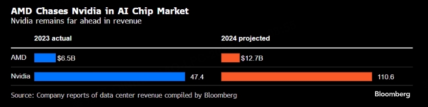 但是,目前的AI GPU市场几乎被英伟达垄断了,从收入对比上看,预计AMD2024年的数据中心收入在127亿美元左右,英伟达在1106亿左右,两者差距明显: