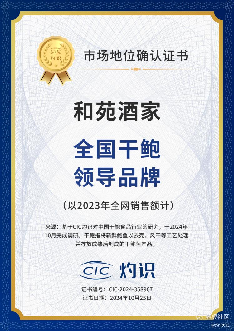 2024年10月25日,和苑酒家获得由知名权威咨询机构CIC灼识咨询授予的“全国干鲍领导品牌”市场地位确认证书!