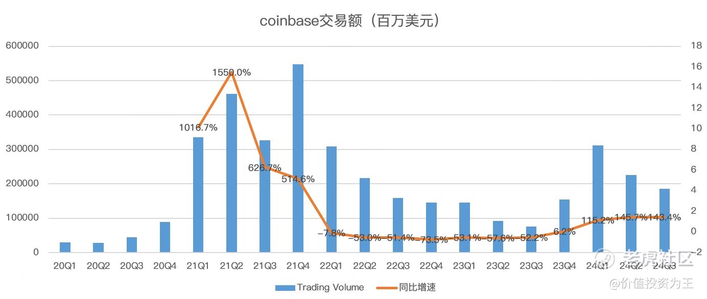 从交易量来看也能验证上述逻辑,比如今年三季度,coinbase总交易额1850亿美元,同比增长143%,环比下跌18%,远低于2021年四季度的5470亿: