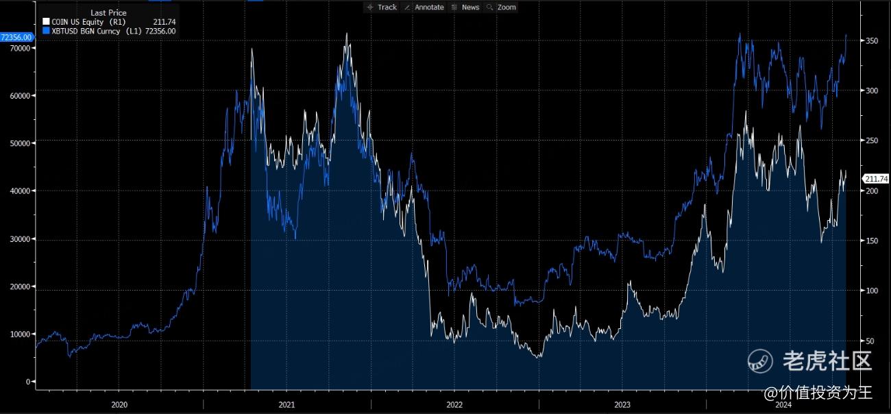回溯过去2年的涨跌幅,coinbase2022年下跌了86%,当年比特币价格下跌64%;2023年,coinbase上涨391%,比特币上涨157%。