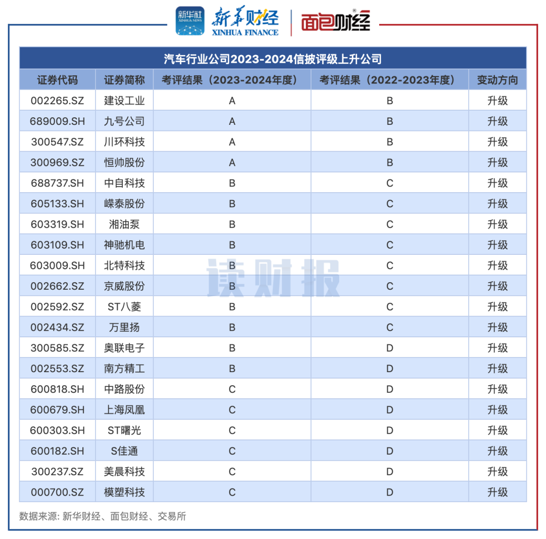 新华财经和面包财经研究员根据交易所近日披露的上市公司2023至2024年度信息披露工作评价结果进行整理研究,本篇为汽车行业篇。