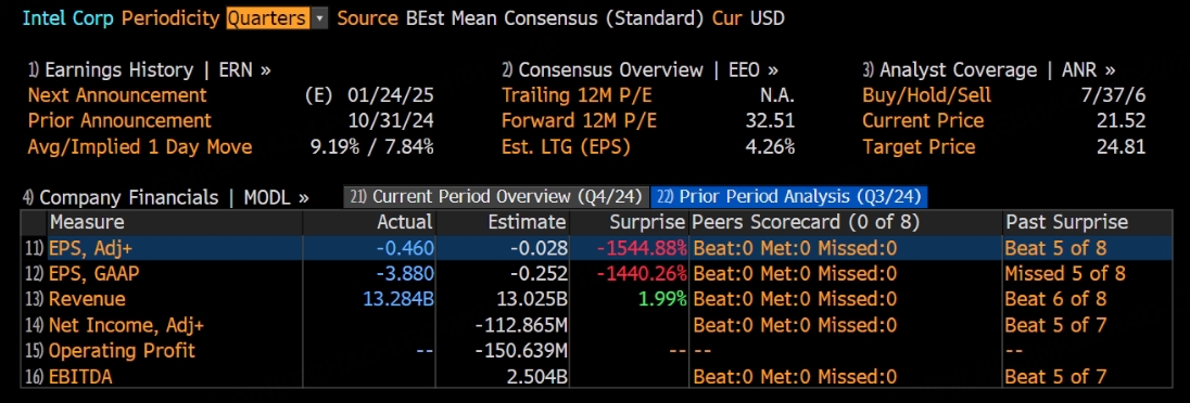 从业绩上看,英特尔三季度营收132.8亿美元,略超分析师预期的130.25亿;每股盈利因三季度巨额的重组和减值费用,导致大幅不及预期: