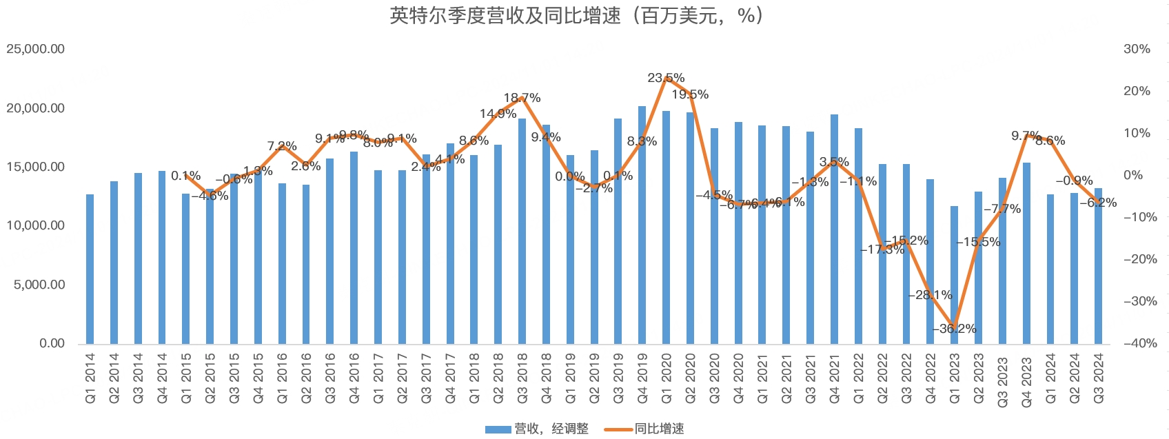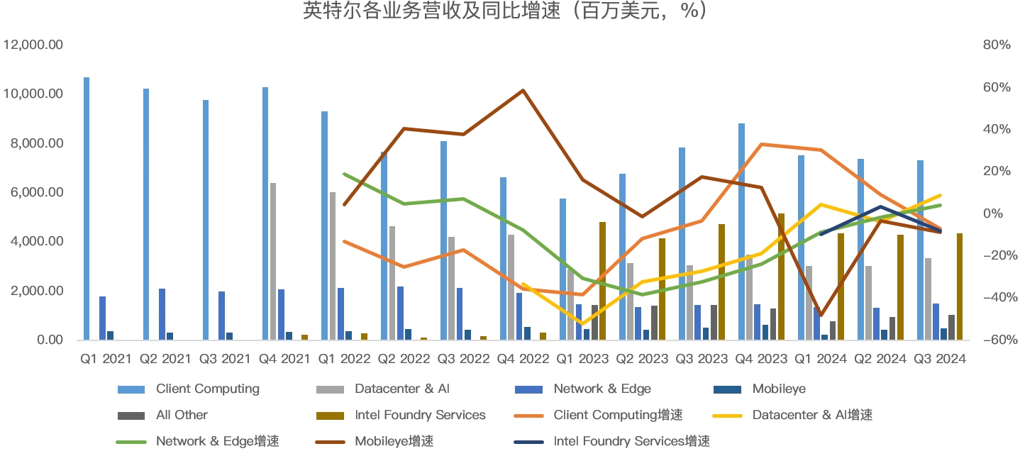 英特尔的对手AMD,三季度PC芯片业务营收增速在29.5%,可见,英特尔曾经的主业依然低迷。