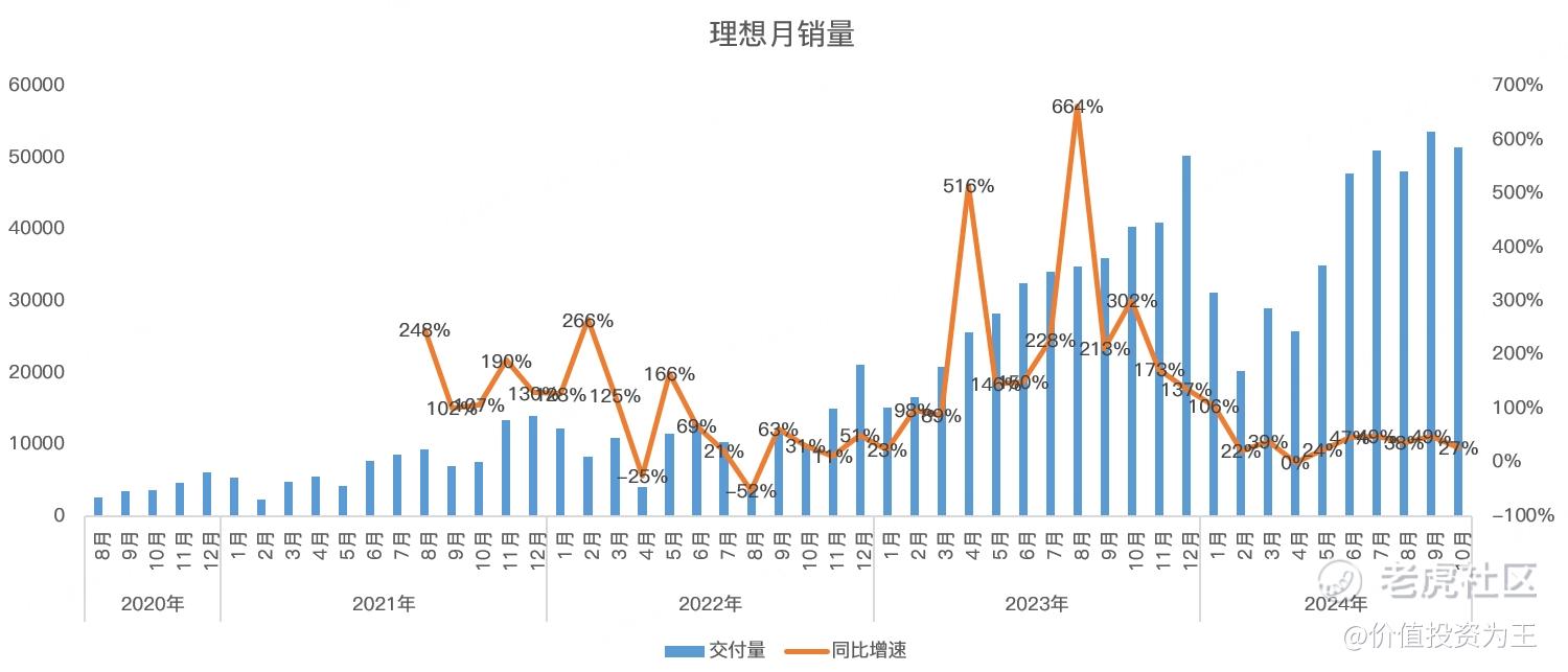 更要命的是,理想10月交付51443辆,同比增长27.3%,环比下滑4.2%: