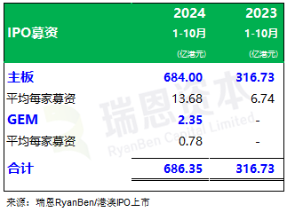 2024年前十个月通过IPO上市的 53家上市公司一共募资686.35亿,较2023年同期的316.73亿增加369.62亿或116.70%,主要原因是超大型IPO美的集团(00300.HK)。
