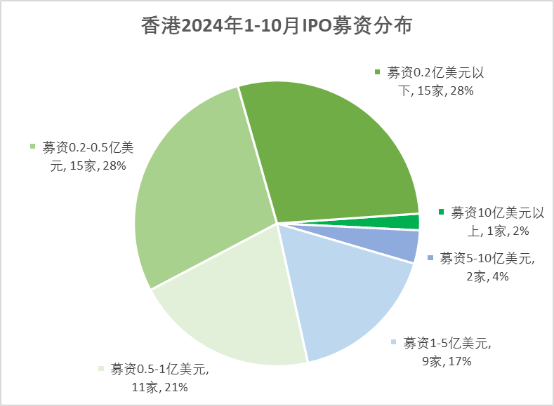 2024年前十个月香港新上市公司共 54家(其中53家通过IPO上市、1家借壳SPAC上市),募资686.35亿(港元,以下同),新上市数量较上年同期增加2家,募资金额按年增加369.62亿或 1.17倍。
