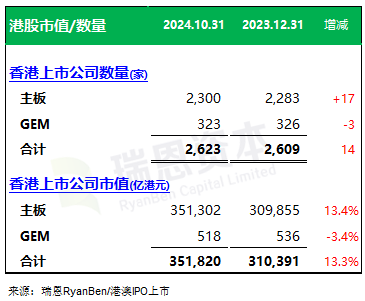 截至2024年10月31日,港交所上市公司2,623家,其中主板2,300家、GEM 323家。