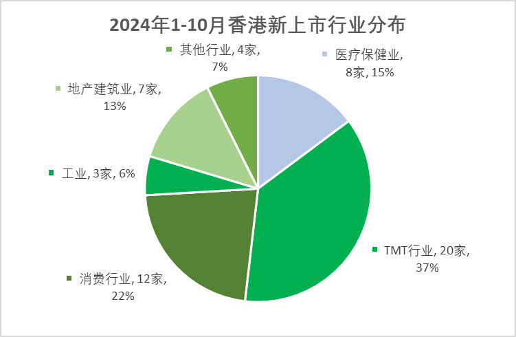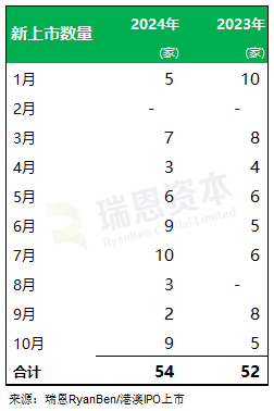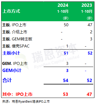 2024年前十个月香港新上市公司共 54家,其中主板上市51家(IPO上市50家、借壳SPAC1家)、GEM上市3家(IPO上市3家)。