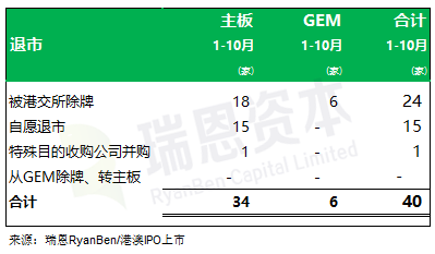 2024年前十个月共 40家上市公司从港交所退市,其中: