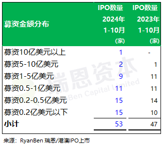 从IPO数量来看,2024年前十个月通过IPO上市的 53家(2023年同期47家IPO)上市公司中: