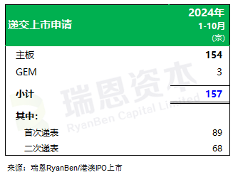 2024年前十个月在香港交易所递交上市申请共157宗,来自主板154宗、GEM 3宗。