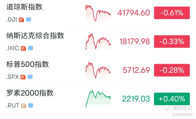 截至收盘,道指跌幅为0.61%;纳指跌幅为0.33%;标普500跌幅为0.28%。