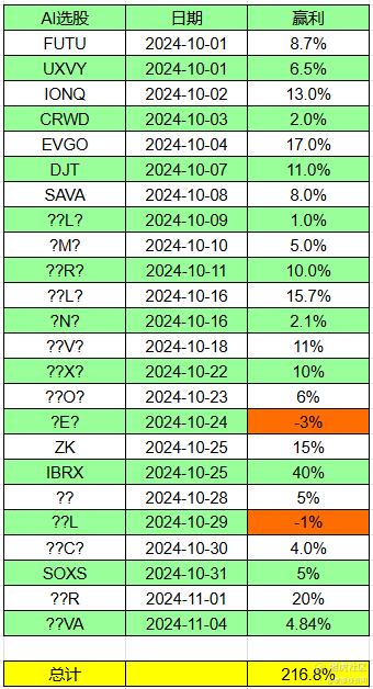 AI选股10月开始总结,截止今天11月4日2024年,共24笔,盈22笔,亏2笔,胜率 91.6%!复合增长率744%!
