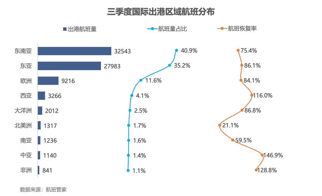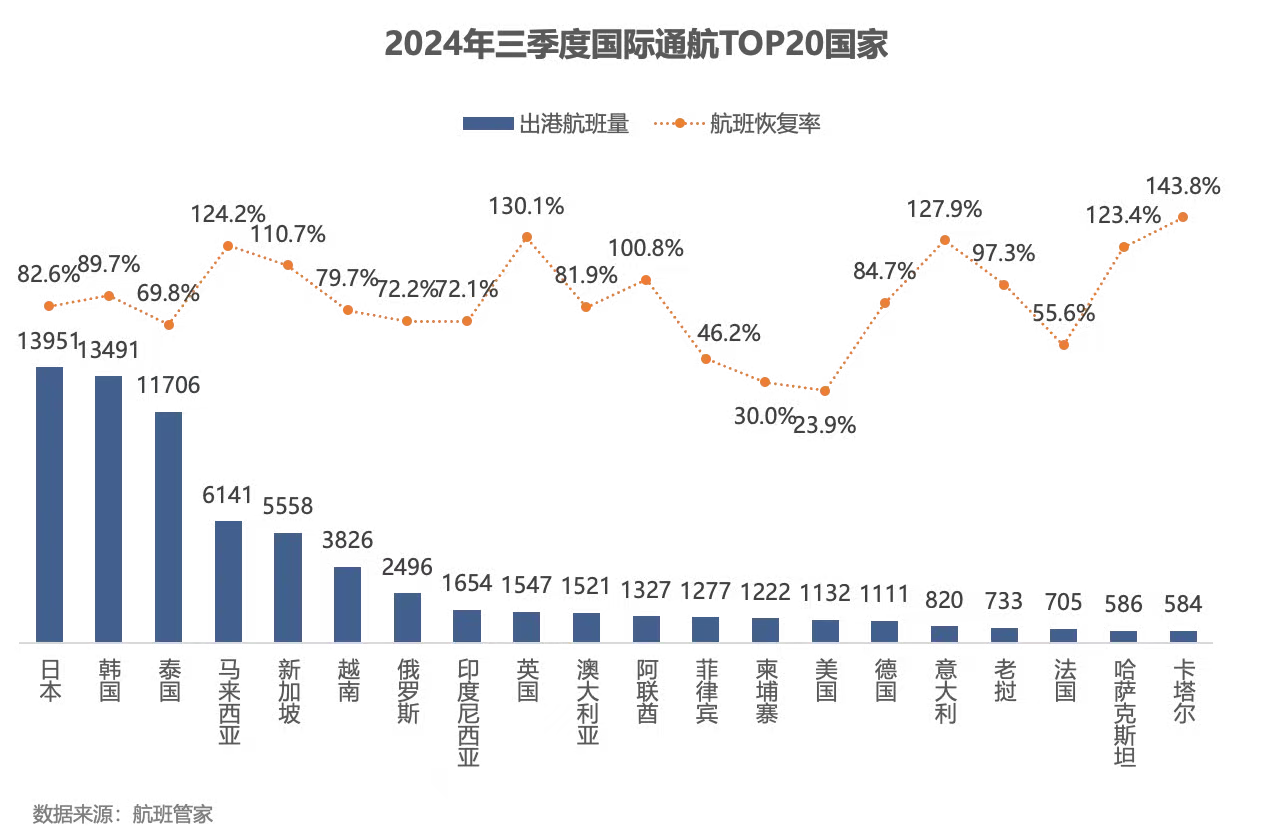 国际航线方面,航班管家数据显示,2024年三季度,我国民航国际航线航班量同比增长62%,恢复至2019年的78.3%。其中,欧美传统国际航线恢复情况依然不尽理想,北美州航班恢复垫底,仅有2019年同期的21%。
