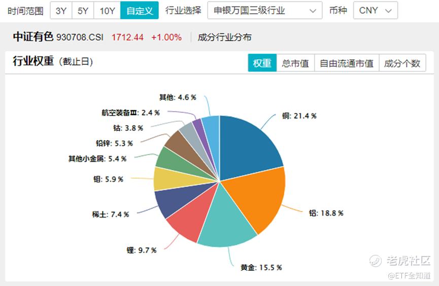 公开资料显示,按照申万三级行业口径,截至三季度末,有色龙头ETF(159876)跟踪的中证有色金属指数中,铜、黄金、铝是前三大重仓行业,权重占比分别为21.4%、18.8%、15.5%,合计占比超55%,稀土行业权重占比7.4%。有望受益于黄金大涨行情,也有望受益于大宗商品上涨周期。