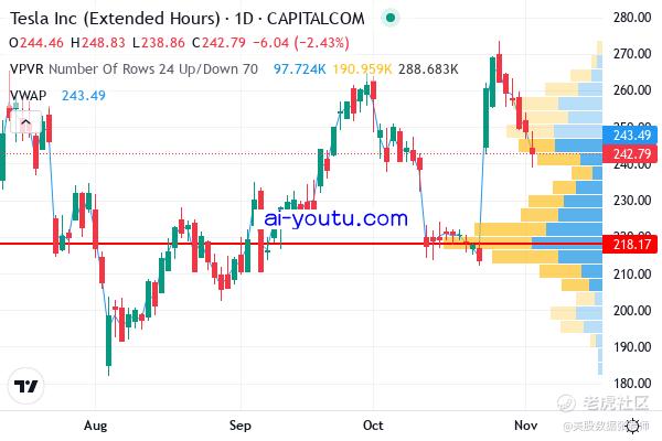 特斯拉 习惯了大起大落 财报出来后 连涨冲上 270, 现在又因为川普交易失色,连续6个阴险打到 240左右。 目前 CALL 期权 280 275 270 260 都特别难受。 PUT 250 240 230 平均分布