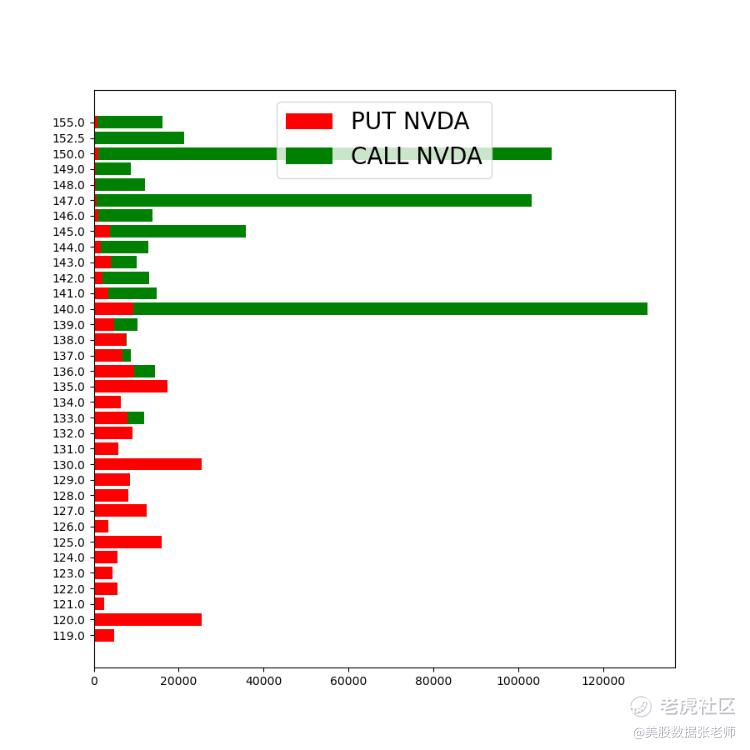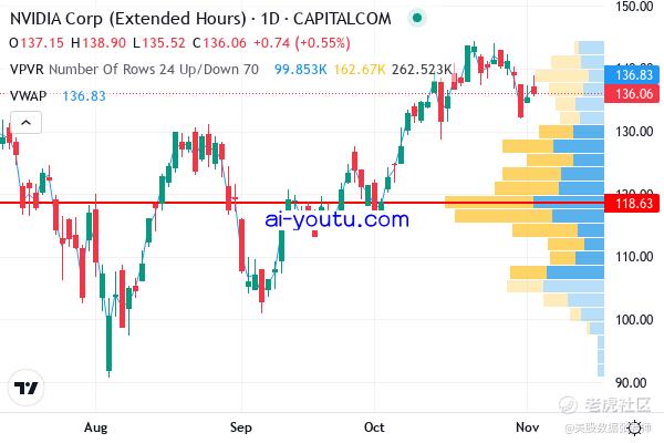 英伟达 Volume Profile 指标显示 118.63成交金额最多 不适合短炒,时候做长线。 市场现在被大选搞得很谨慎。英伟达昨日势头猛也收了上引线 目前 CALL 期权未平仓最多的集中在 150 147 140, PUT 135 下跌较多