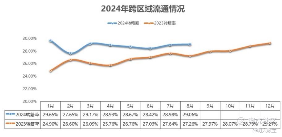 今年1-8月,我国汽车在跨区域自由流通、“以旧换新”等政策驱动下,车辆转籍率始终高于2023年。