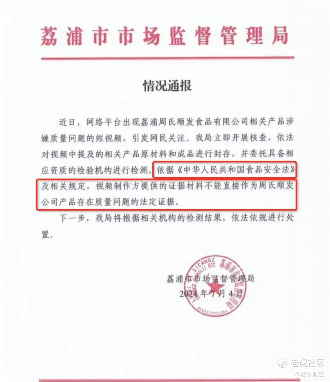 同时强调,依据《中华人民共和国食品安全法》及相关规定,视频制作方提供的证据材料不能直接作为周氏顺发公司产品存在质量问题的法定证据。下一步,我局将根据相关机构的检结果,依法依规进行处置。