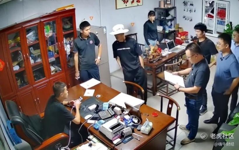 7月初,狂飙兄弟(戴白帽者)一行人来到济南某二手车商处“打假”的场景