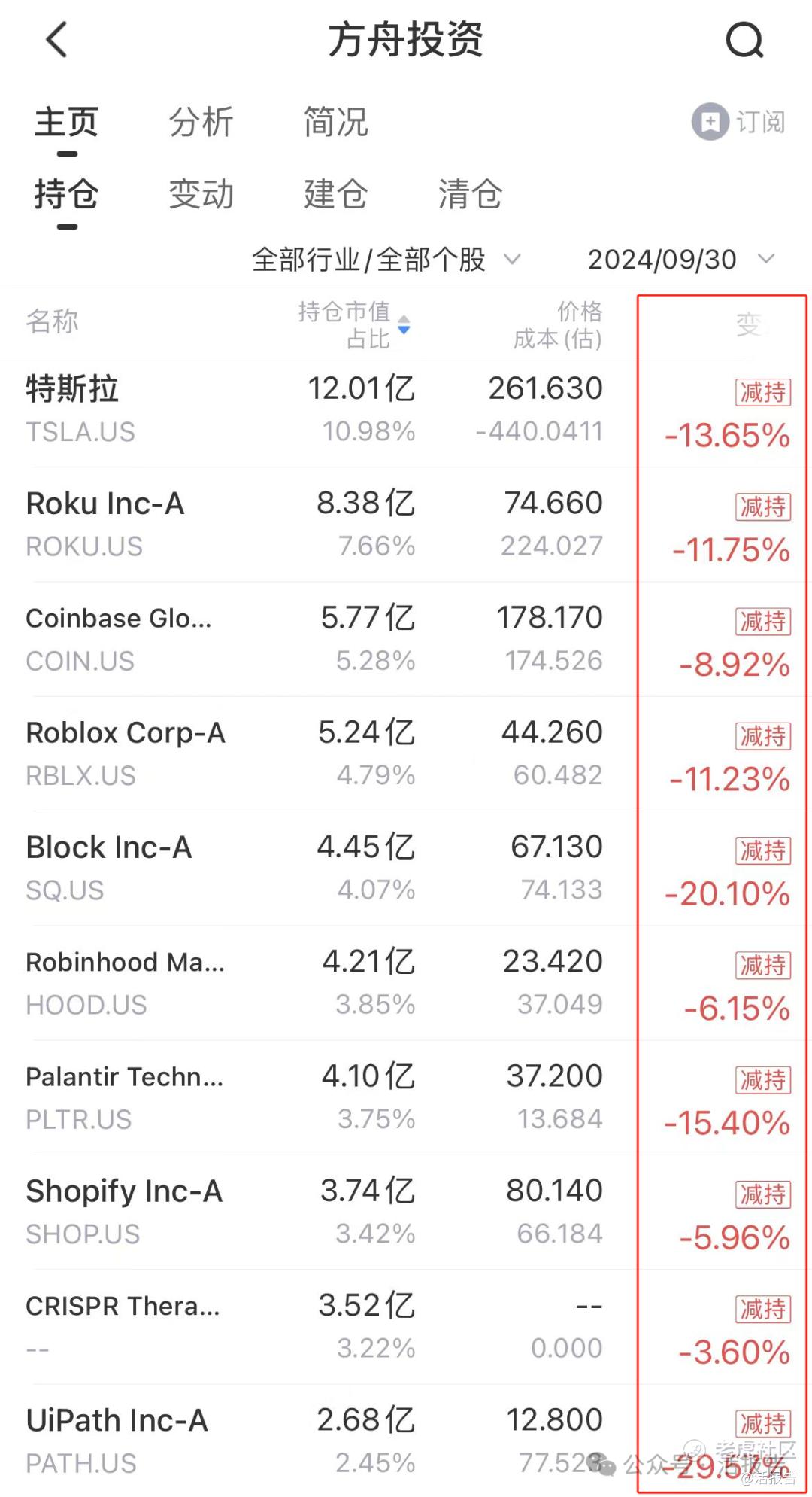 2024Q3,ARK对前十大重仓股的头寸全部进行了削减,其前五大重仓股特斯拉、Roku、Coinbase、Roblox、Block分别被减持了13.65%、11.75%、8.92%、11.23%、20.10%。