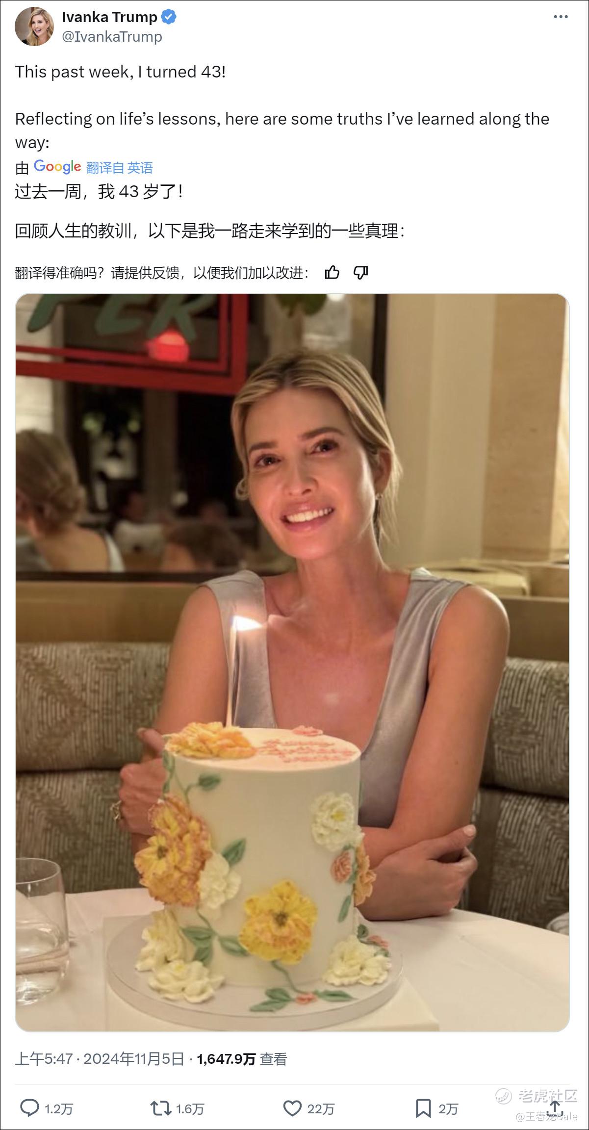 3.美国第60届总统大选正在进行中,深受网友们喜欢的伊万卡,这次在生日庆祝中狂发鸡汤文案,似乎也在用另外一种方式助威自己的父亲能够获胜。 $川大智胜(002253)$ $特朗普媒体科技集团(DJT)$ $特朗普概念(BK4516)$