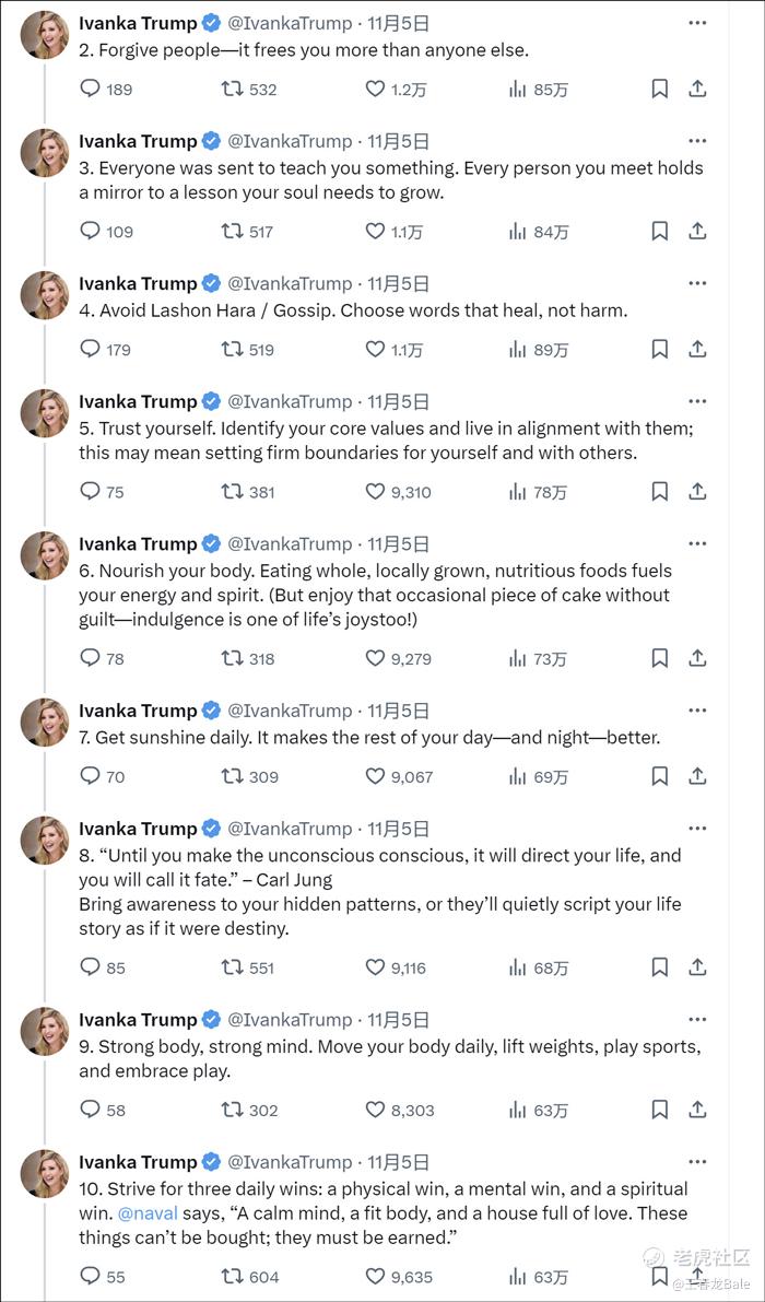 1.11月5日,美国前总统川普的女儿——伊万卡·川普,在社交媒体上发文庆祝自己的43岁生日,她发布了17条让人非常动容的鸡汤内容,包括珍惜家人和朋友关系;宽恕他人;你遇到的每个人都是一面镜子,照耀着你灵魂成长所需的教训;避免流言蜚语;相信自己;滋养身体等等。