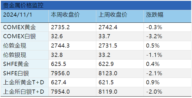 贵金属方面,上周COMEX黄金下跌0.55%,白银下跌5.22 %;沪金2410合约下跌0.46%,沪银2410合约下跌5.12%。主要工业金属价格中,COMEX铜、沪铜分别变动-7.53%、-3.01%。