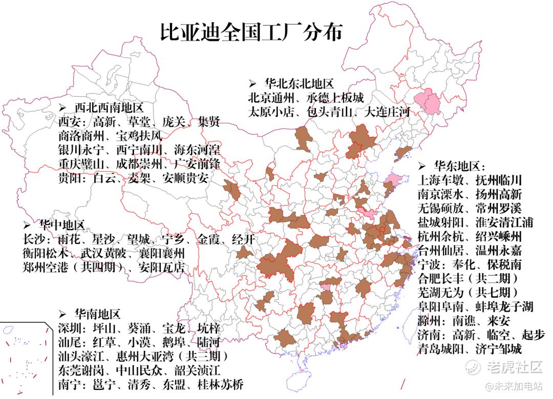 比亚迪一年交付四百万,五百万,甚至六百万台时,必然也具备相应的产能。但很少有人注意到,比亚迪的工厂都建在了哪里——我直接放一张图给大家看看: