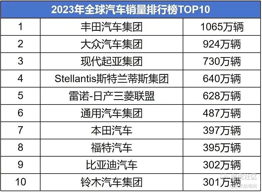 在2023年的榜单上,比亚迪以302万的销量位列第九,已经有资格跟全球大车企坐在一桌上吃饭了。如果仔细看这个榜单上具体的名次和对应销量,也许你会问:按照600万台来计算,明年比亚迪为啥不是第六名呢?
