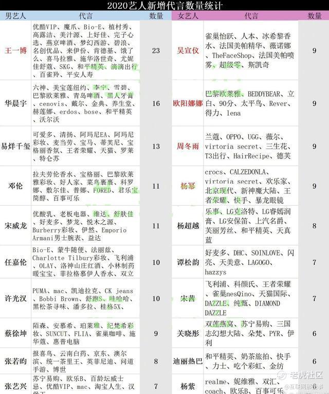 而女明星代言的市场不断挤压,2020女明星新增代言中,女明星代言化妆品的数量明显少于男明星,就连一线大话杨幂2020年都没有新增的化妆品代言。