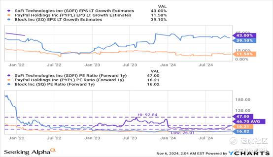 SoFi在过去两年中盈利能力有了显著提高,现在已实现GAAP盈利。这家金融科技公司的股票目前以47.0倍的市盈率交易,与SoFi过去三年的平均市盈率持平。用来比较SoFi的行业组包括PayPal和Block,考虑到金融科技市场的总体增长。SoFi预计将有43%的最大EPS增长率,这主要是由于金融科技公司在增长其客户基础方面的成功。Block是投资者的Cash App游戏,而PayPal作为资本回报游戏的吸引力而值得看好。然而,与SoFi相比,两家金融科技公司都有更低的前瞻性市盈率,部分原因是SoFi预计将有最强的EPS增长。