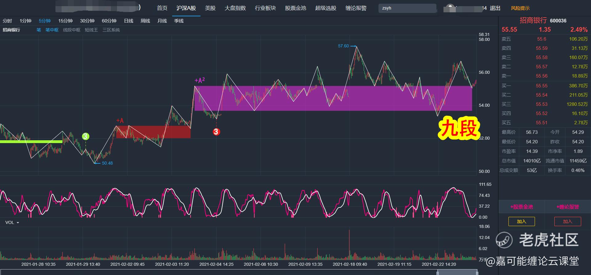 至于短线就是5分钟K线结构了,招商银行(600036)属于缠论九段,如下图所示: