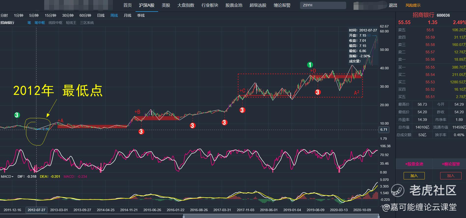 从大周期周K线上看招商银行(600036)从2012年以来就一直处于向上趋势,涨势缠论步步为赢(营),如下图所示: