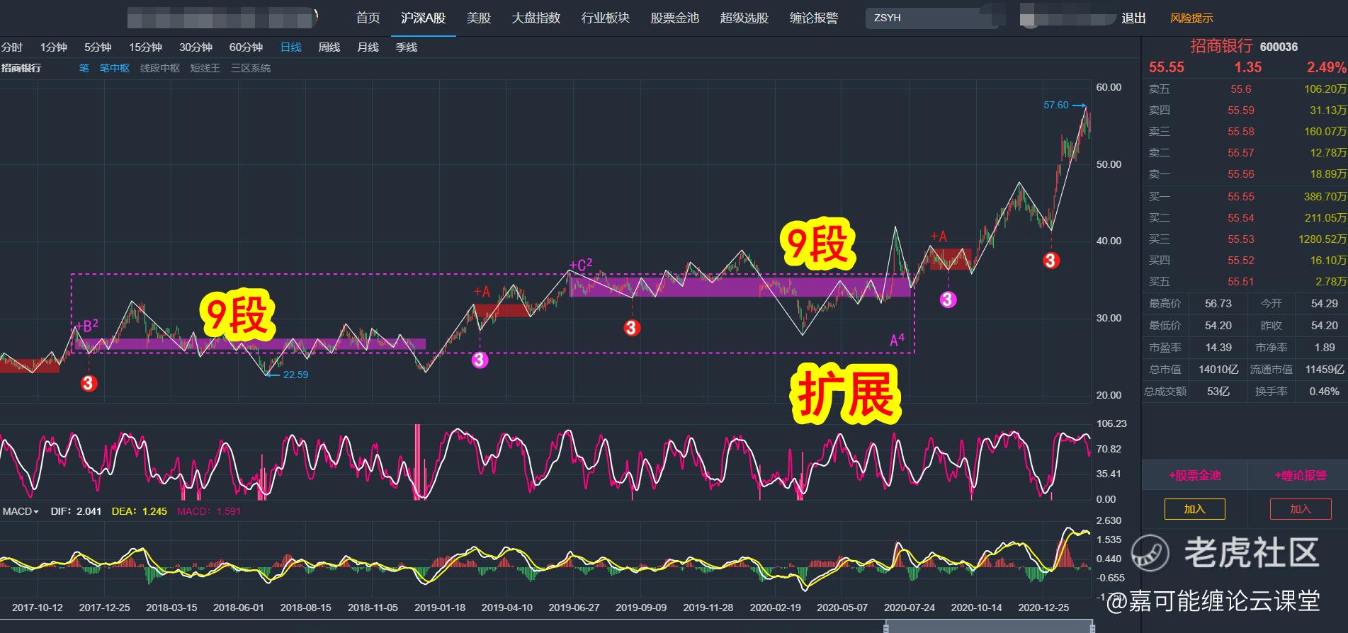 而在日线招商银行(600036)属于缠论K线强势力度,不是缠论九段,就是缠论扩展,如下图所示: