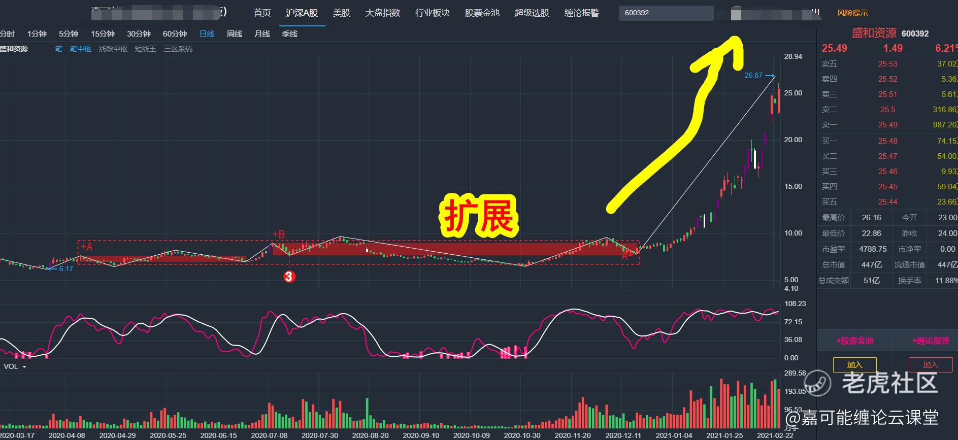 比如,近期的有色板块牛股-盛和资源(600392)上涨前就出现缠论扩展,如下图所示: