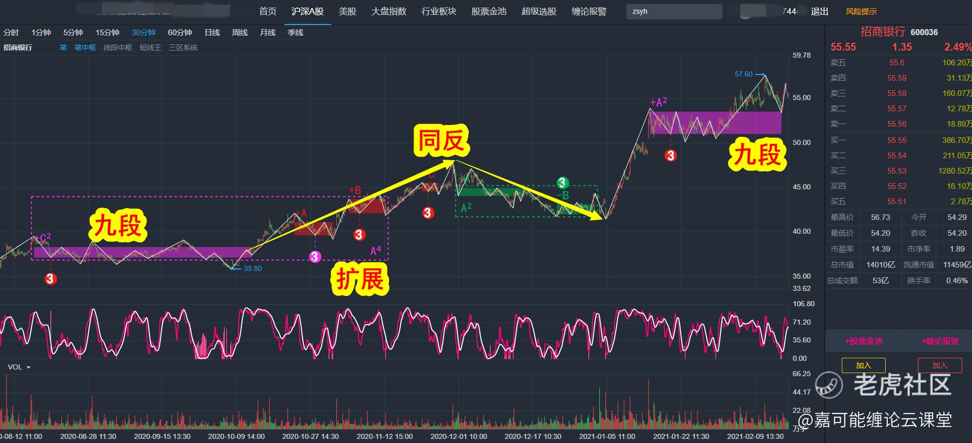 上图黄色箭头就是标准的缠论同反,缠论同反往往属于一种深回调。不过需要注意,大盘蓝筹股的同反,深回调的概率比较低,通常十来二十个点的波动已经很夸张了。小盘股波动率会深一些。缠论同反属于缠论中枢升级的第三种形式。上图所示招商银行(600036)再30分钟最新段属于标准的缠论扩展,意味着,还要继续往上。对于中长线的价值型投资,这种状态就不适合打差价了,持股待涨是最佳选择。
