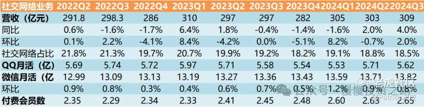 社交网络Q3营收309亿,同比增长4%,视频号直播服务以及小游戏平台服务费收入增长,但音乐直播及游戏直播服务收入下降,腾讯音乐直播收入会越来越少,视频号相关收入会越来越多。