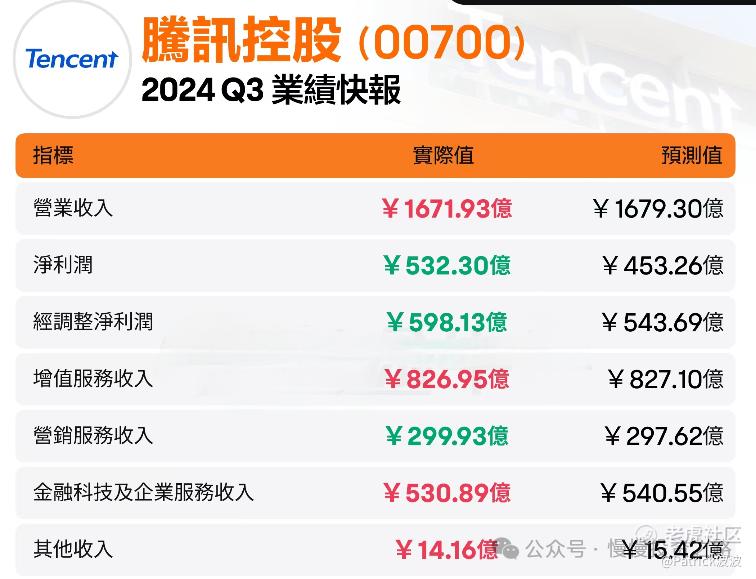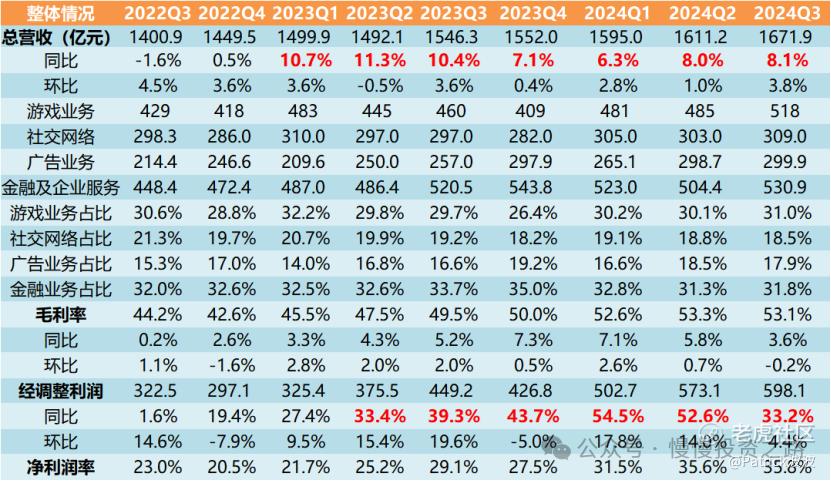 今天 $腾讯控股(00700)$ 公布了2024年三季度财报。总体来看财报数据还是比较平淡,营收1671.9亿元,同比增长8%,上季度增速持平,调整后净利润598.1亿元,同比大增33.6%,调整后净利润连续6个季度同比增长超过30%。营收和净利润均创历史新高。分业务来看,游戏业务增长12.6%,广告业务增长16.7%,社交网络增长4%,金融科技增长2%。