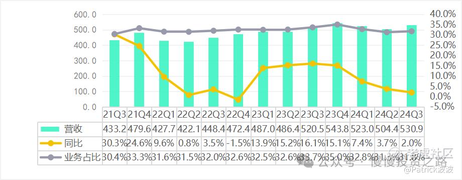 金融及企业服务方面,2024年Q3收入人民币530.9亿元,同比增长2%。这块对于腾讯来说,增速不高,但占比高,而且主要是敏感的金融业务,想想蚂蚁,但可以肯定的是这块毛利一定非常高,以致于要把腾讯云这种亏损的业务要合在一起,不然可能会过于太亮眼以致于招来不必要的麻烦,个人是这么理解的。