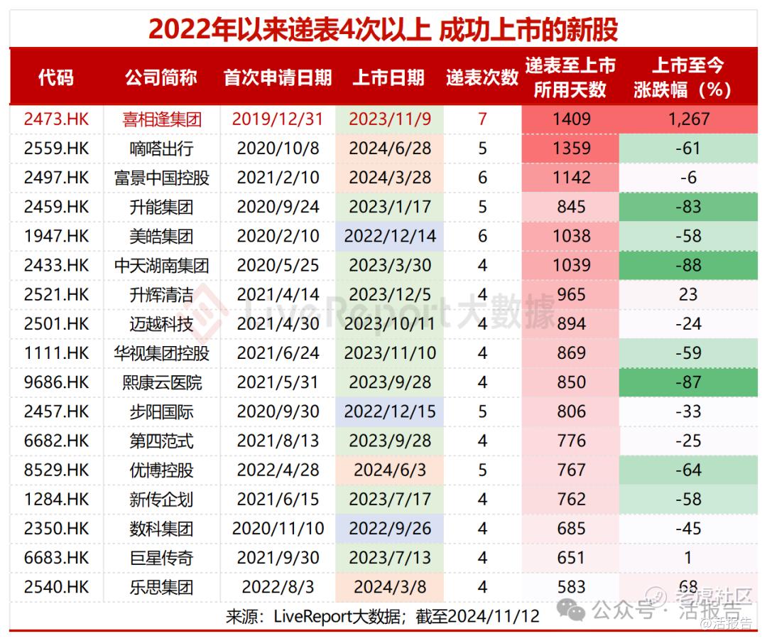 值得一提的是,昔日的递表“钉子户”,在上市后成为了“十倍股”。喜相逢集团递交7次上市申请后,于2023年11月9日顺利在港交所挂牌上市,历时1409天。截至2024年11月12日,喜相逢上市之后股价累计涨幅达到12.67倍。