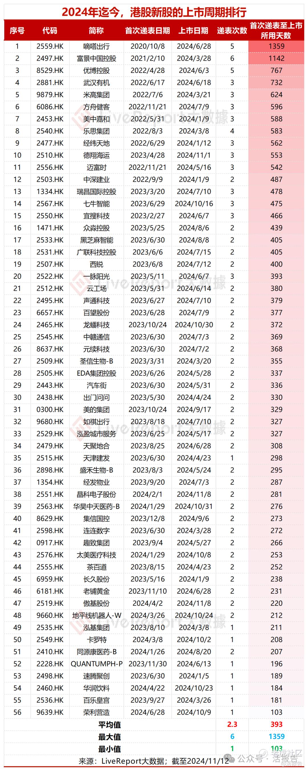 其中,上市周期最长的是嘀嗒出行,共递表5次,首次递表至挂牌上市耗时1359天;其次为富景中国控股,递表6次,耗时1142天。上市周期最短的是荣利营造,递表1次,首次递表至挂牌上市仅耗时103天。