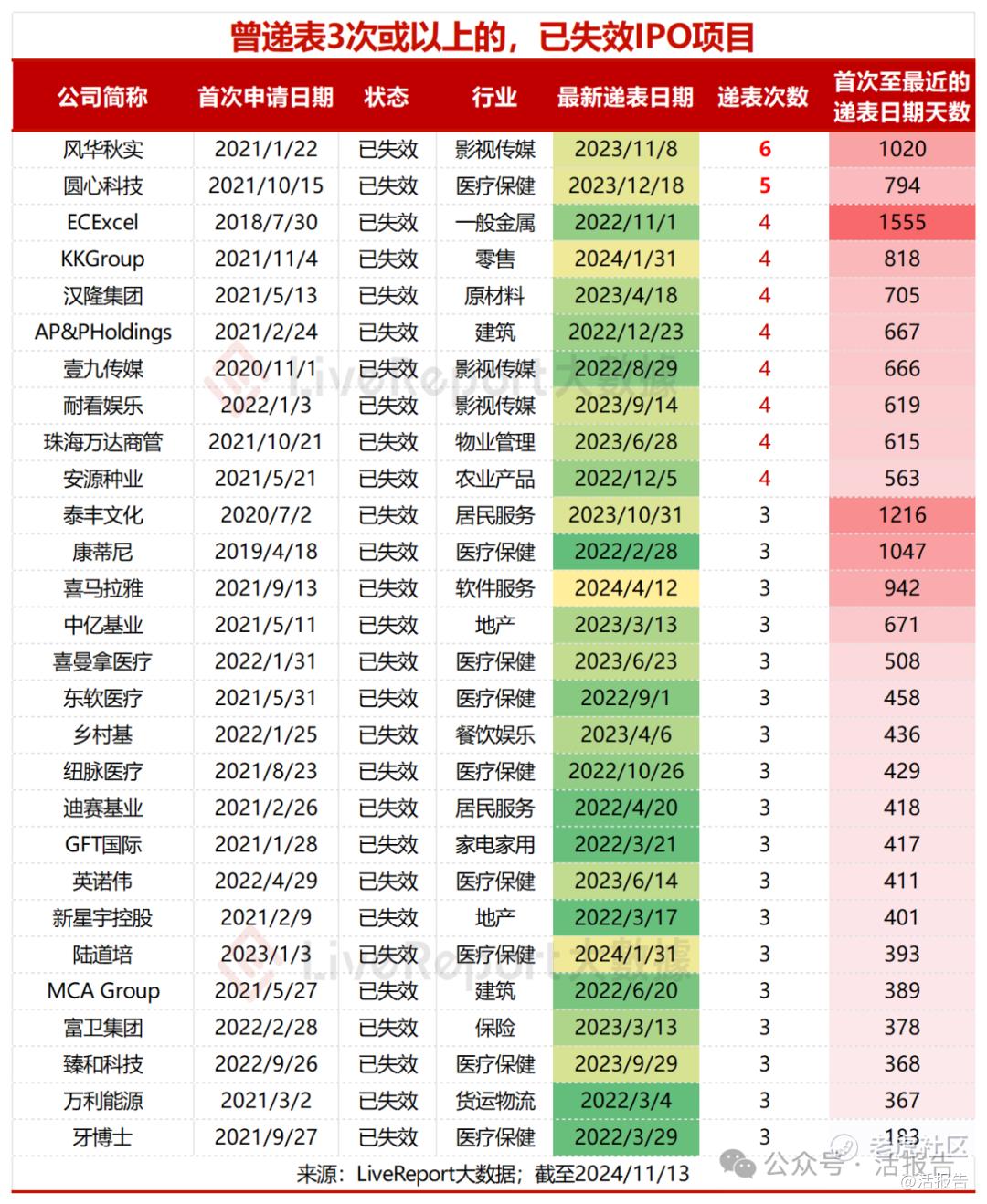 据LiveReport大数据统计,2022年以来已失效的IPO项目共计141家,占比33.7%,递表次数在3次以上的有28家,包括风华秋实、圆心科技等,其中圆心科技曾于2024年2月9日通过港交所上市聆讯,但市场传闻其已暂缓香港上市计划。
